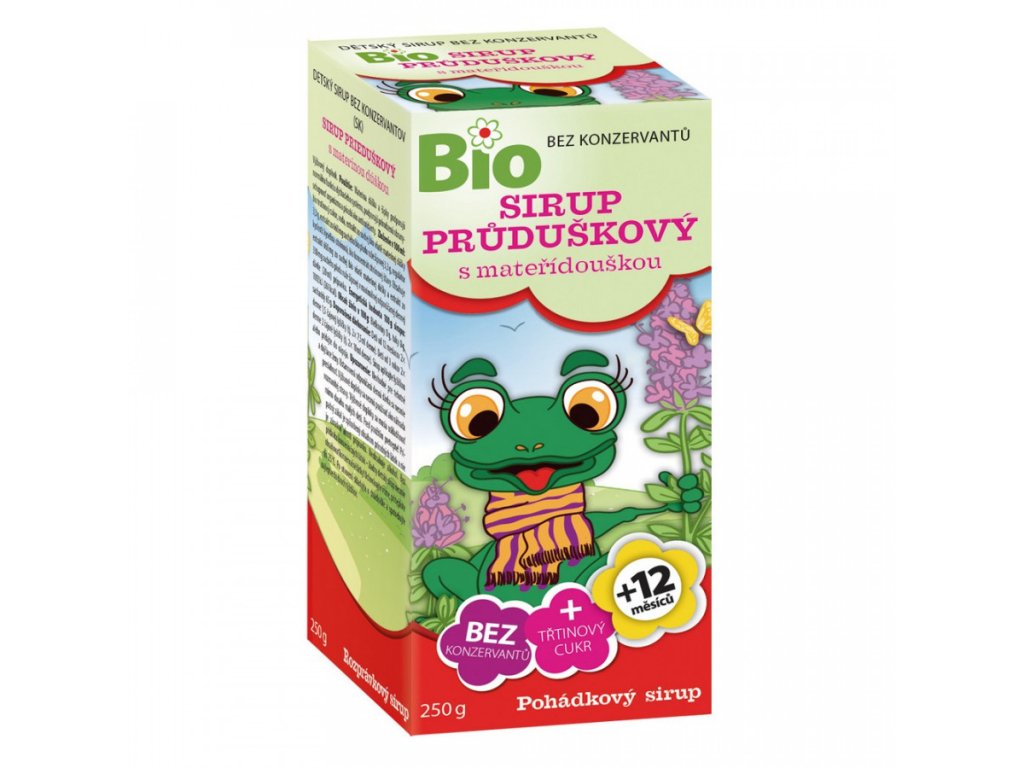 Použití: Mateřídouška a šípky mají příznivý účinek na normální funkci dýchacího systému, podporují přirozenou obranyschopnost organismu a působí jako antioxidant. Složení bylo schváleno Českou pediatrickou společností, je vhodné pro děti od 1 roku.Zařazení: Doplněk stravy. Bylinný sirup pro děti.Složení ve 100 ml: Bio třtinový cukr, voda, extrakt ze suché bio natě mateřídoušky 3,3 g, extrakt ze suchého bio plodu šípku 3,3g, regulátor kyselosti: kyselina citronová, bio koncentrát citronové šťávy. Obsahuje extrakt z 660 mg suché nati mateřídoušky a 660 mg suchého plodu šípku v maximální doporučené denní dávce (20ml) přípravkuDoporučené dávkování: Děti od 12 měsíců 2 x denně 1,5 čajové lžičky (tj. 2x 7,5 ml denně). Děti od 3 let 2 x denně 2 čajové lžičky (tj. 2x10 ml denně). Sirup aplikujte lžičkou nebo přidejte do nápoje.Upozornění: Nevhodné pro těhotné a kojící ženy. Není určeno jako náhrada pestré stravy. Nepřekračujte doporučené dávkování. Před použitím protřepejte! Případný zákal je způsoben obsahem přírodních látek a není na závadu jakosti přípravku. Neobsahuje alkohol. Bez přídavku konzervačních látek - žádný dětský sirup nesmí obsahovat konzervanty! Ukládejte mimo dosah dětí.Skladování: Uchovávejte v temnu, při teplotě do 25˚C. Po otevření skladujte v lednici a spotřebujte nejlépe do 2 týdnů.Energetická hodnota 100 g sirupu:1092 kJ (261 kcal). Obsah živin ve 100 g: bílkoviny 0 g, tuky 0 g, sacharidy 65 g. Hmotnost netto: 250 gVýrobce: MEDIATE, s.r.o., Dolní Libchavy 325, 561 16 Libchavy, ČR .