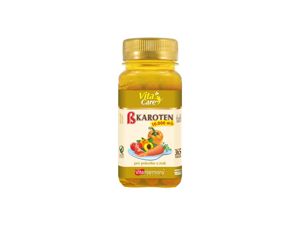 Celoroční balení přípravku Beta karoten 10. 000 m.j. (6 mg) za bezkonkurenční cenu 0,67 Kč na jednu tobolku. Karoteny jsou látky ze skupiny karotenoidních barviv, z nichž nejrozšířenější a nejznámější je beta karoten. Je významným prekurzorem vitaminu A, který přispívá k udržení normálního stavu zraku, pokožky a imunity. V těle dochází k biochemické přeměně beta karotenu a to jen do té míry, kolik tělo právě potřebuje, zbytek se bezpečně vyloučí. Nehrozí tedy předávkování jako u vitaminu A. Neobsahuje cukr ani barviva. Je vhodný pro diabetiky. Karotenoidy jsou látky, které se vyskytují převážně v ovoci a zelenině a dávají jim typické žluté a oranžové zabarvení. Nejbohatšími zdroji beta karotenu jsou mrkev, meruňky, rajče, mango, broskve, špenát, brokolice nebo paprika. Karotenoidy se také vyskytují v živočišných zdrojích, např. dávají zabarvení vaječnému žloutku, máslu nebo masu lososa. Beta karoten je přirozeným zdrojem vitaminu A. Doporučuje se užívat jej v kombinaci se selenem a vitaminem E. 6 mg = 10.000 m.j. beta karotenu v jedné měkké želatinové tobolce. Užívání beta karotenu je velmi důležité nejen v létě, ale také před zimní dovolenou. Zatímco voda odráží 25 % UV záření, které se k přímému záření přičítá, sníh odráží až 80%.