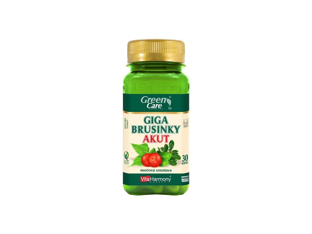 Doplněk stravy Giga Brusinky Akut je přípravek přírodního charakteru, který díky svému složení vykazuje rychlou a vysokou účinnost v lidském organismu. Přípravek je určen pro rychlou pomoc při akutních potížích s močovým systémem. Jeho základem je silný extrakt z brusinky (Vaccinium macrocarpon.), jehož účinky jsou podpořeny působením který je doplněn medvědicí lékařskou, kopřivou dvoudomou a D-manózou. Brusnice velkoplodá je tradiční přírodní prostředek pro podporu močových cest. Mimo jiné brusinka podporuje přirozenou obranyschopnost organismu a funkci imunitního systému. Medvědice lékařská, latinsky Arctostaphylos uva-ursi, je léčivá bylina, která se využívá pro své diuretické a antiseptické účinky. Podporuje léčbu zánětů ledvin, močového měchýře a močových cest a působí antioxidačně, což znamená, že snižuje míru oxidačního stresu v organismu. Kopřiva dvoudomá, latinsky Urtica dioica, je léčivá bylina, která působí močopudně a protizánětlivě. Kopřiva podporuje normální činnost ledvin a močové soustavy. D-manóza je přírodní monosacharid, který se přirozeně vyskytuje v lidském organismu. V těle se D-manóza prakticky nepřeměňuje, ale snadno se vstřebává do krve. Odtud je filtrovaná ledvinami do moči, kde silně působí na eliminaci výskytu a ulpívání patogenních bakterií v močových cestách, které jsou příčinou jejich infekcí. Doplněk stravy Giga Brusinky Akut obsahuje v doporučené denní dávce množství ekvivalentní 40 gramům čerstvých brusinek. Pro maximální účinek je nejlepší rozdělení celé denní dávky na více menších dávek, které se užívají v průběhu celého dne. Přípravek není určen pro dlouhodobé užívání bez přestávek. Všeobecně se doporučuje užívání přípravku během akutních potíží a poté pokračovat v jeho užívání ještě asi 5 až 10 dní. Celková doba užívání by měla být maximálně 2 týdny. Doplňková kúra se může opakovat podle potřeby, maximálně však pětkrát za rok. Doplněk stravy Giga Brusinky AKUT má nejsilnější účinky při zásadité reakci moči. Proto doporučujeme užívat tento doplněk stravy společně s prostředky, které napomáhají zvyšovat pH moči – kapsli zapijte např. sklenicí vody s rozmíchanou špetkou jedlé sody.