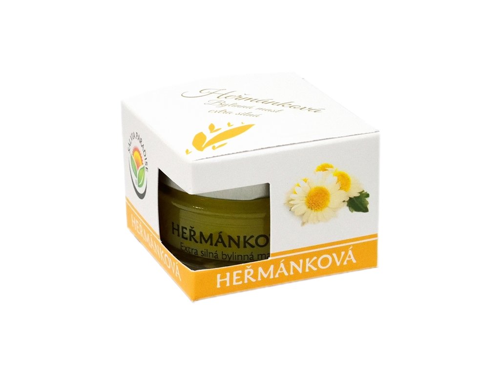 Extra silná heřmánková bylinná mast s regeneračním účinkem. Zklidňuje podrážděnou pokožku. Hodí se na ošetření popraskané kůže a rtů.