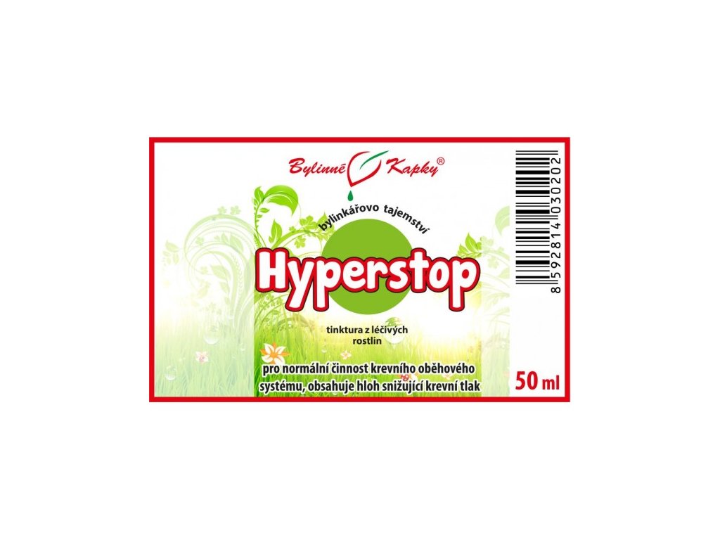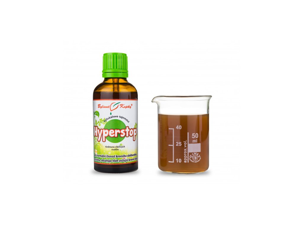 Hyperstop (bylinná tinktura - bylinné kapky z řady Bylinkářovo tajemství). Přírodní bylinný extrakt z léčivých rostlin pro normální činnost kardiovaskulární soustavy při vysokém krevním tlaku.