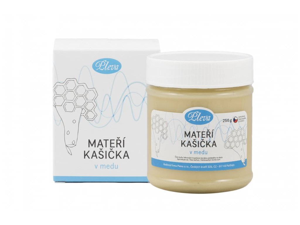 „Věděli jste, že se včelí královna dožívá až 20× vyššího věku než běžná dělnice? Líhnou se přitom úplně stejně. Jediným rozdílem je strava – královna celý život dostává mateří kašičku. Ta dodává včelkám velkou životní sílu a navrch ještě porci vitamínů a minerálů. Jen díky ní vydrží královna náročné životní tempo a dalece přežívá všechny v úlu. Nejčastěji ji najdeme v pleťových krémech, ale podává se také v ampulích nebo v tabletách. Lidově má také přezdívku "včelagra". Do tohoto medu jsme jí přidali 3 %. “