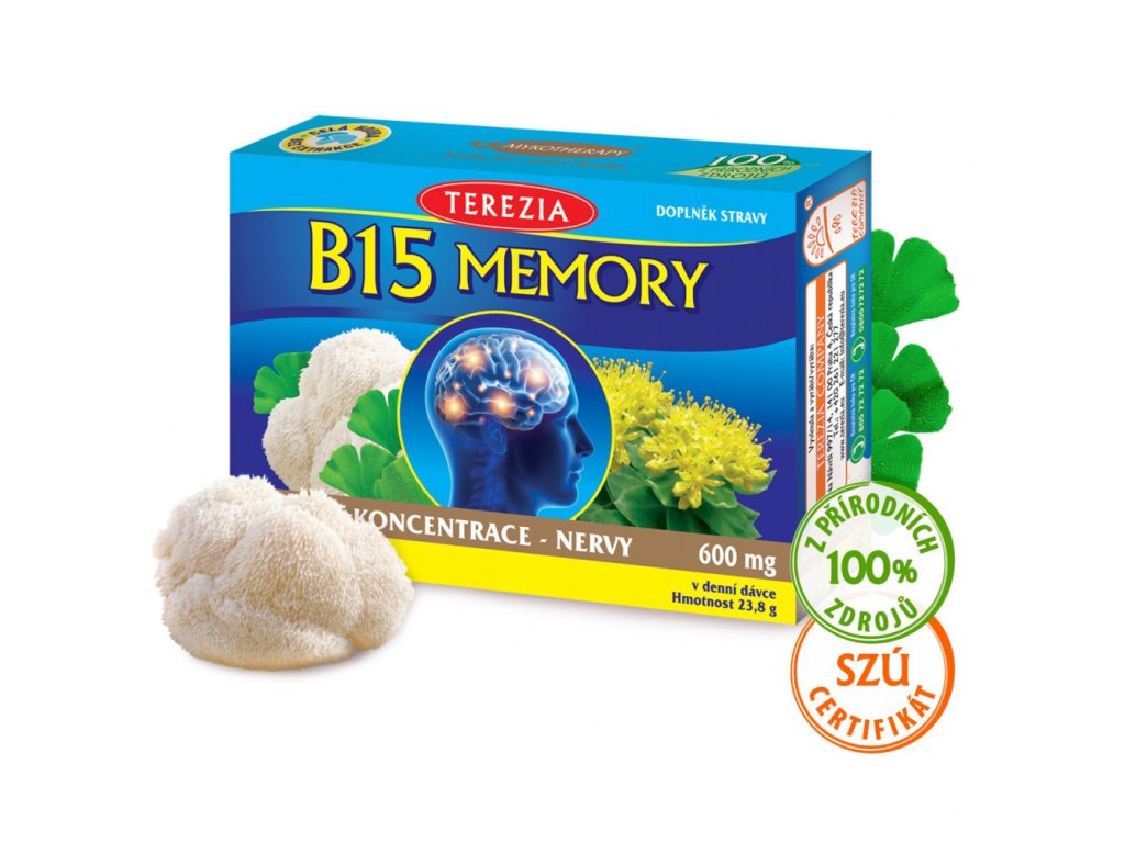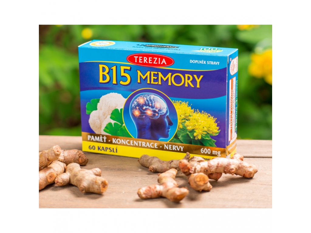 1 kapsle obsahuje 300 mg směsi B15 MEMORY [prášek sušené houby korálovce ježatého (Hericium erinaceus) 100 mg, prášek kurkumy dlouhé (Curcuma longa) 70 mg, extrakt bakopy drobnolisté (Bacopa monnieri) 50 mg, extrakt rozchodnice růžové (Rhodiola rosea) 40 mg, extrakt jinanu dvoulaločného (Ginkgo biloba) 20 mg, sušené pivovarské kvasnice (s obsahem kyseliny pangaminové v přírodní formě) 20 mg].