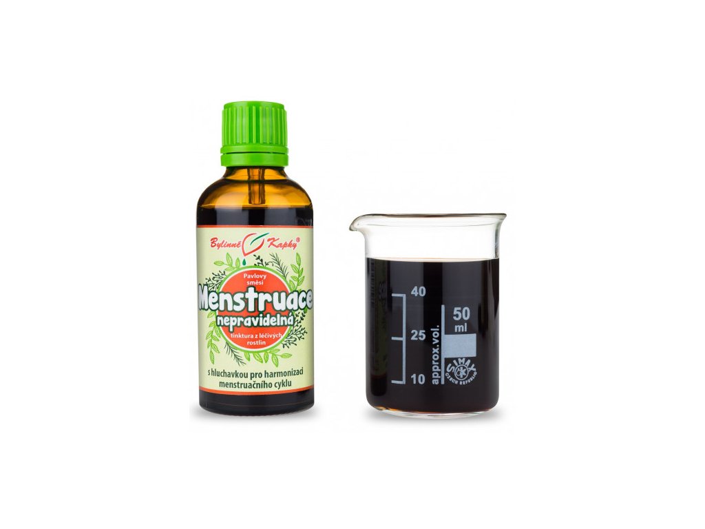 Menstruace nepravidelná (bylinná tinktura - Pavlovy bylinné kapky). Přírodní bylinný extrakt z léčivých rostlin pro menstruační komfort. Slouží pro harmonizaci menstruačního cyklu. Směs příznivě ovlivňuje hormonální systém, navozuje pravidelnou menstruaci a působí proti gynekologickým potížím.
