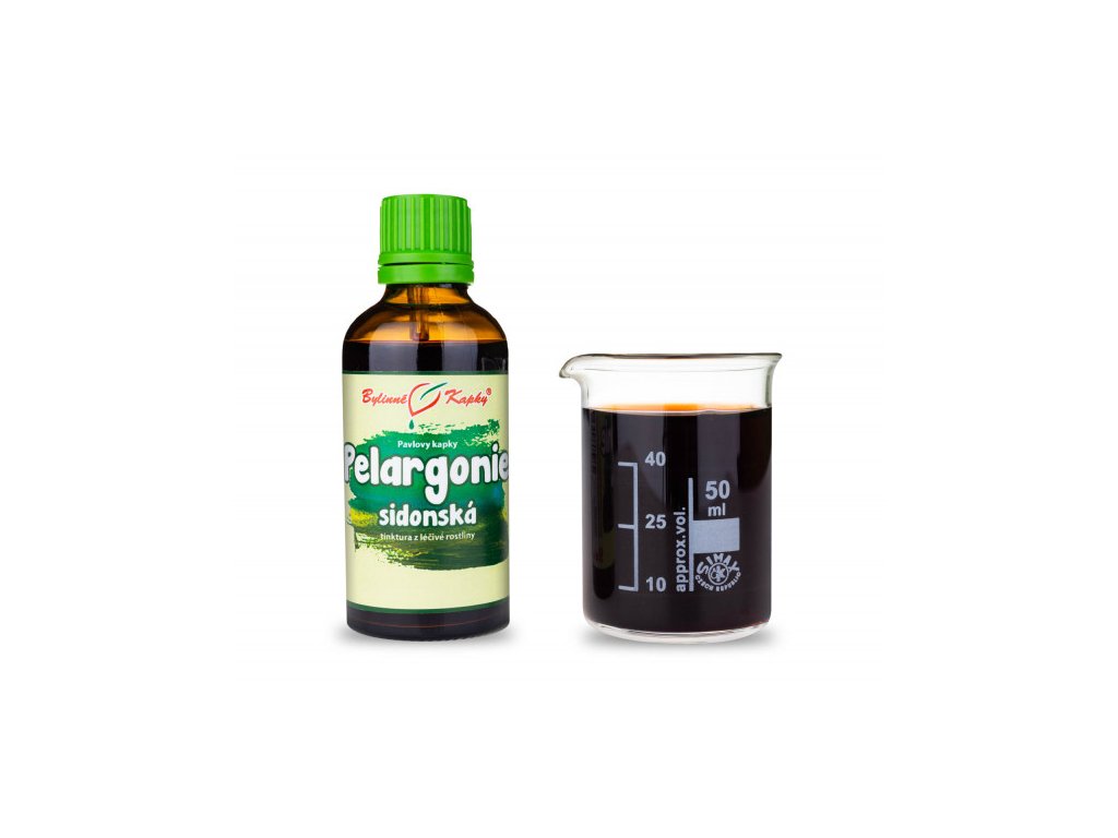 Pelargonie sidonská (bylinná tinktura - Pavlovy bylinné kapky). Přírodní bylinný extrakt z kořenů léčivé rostliny pelargonie sidonské pro normální funkce dýchacího systému.