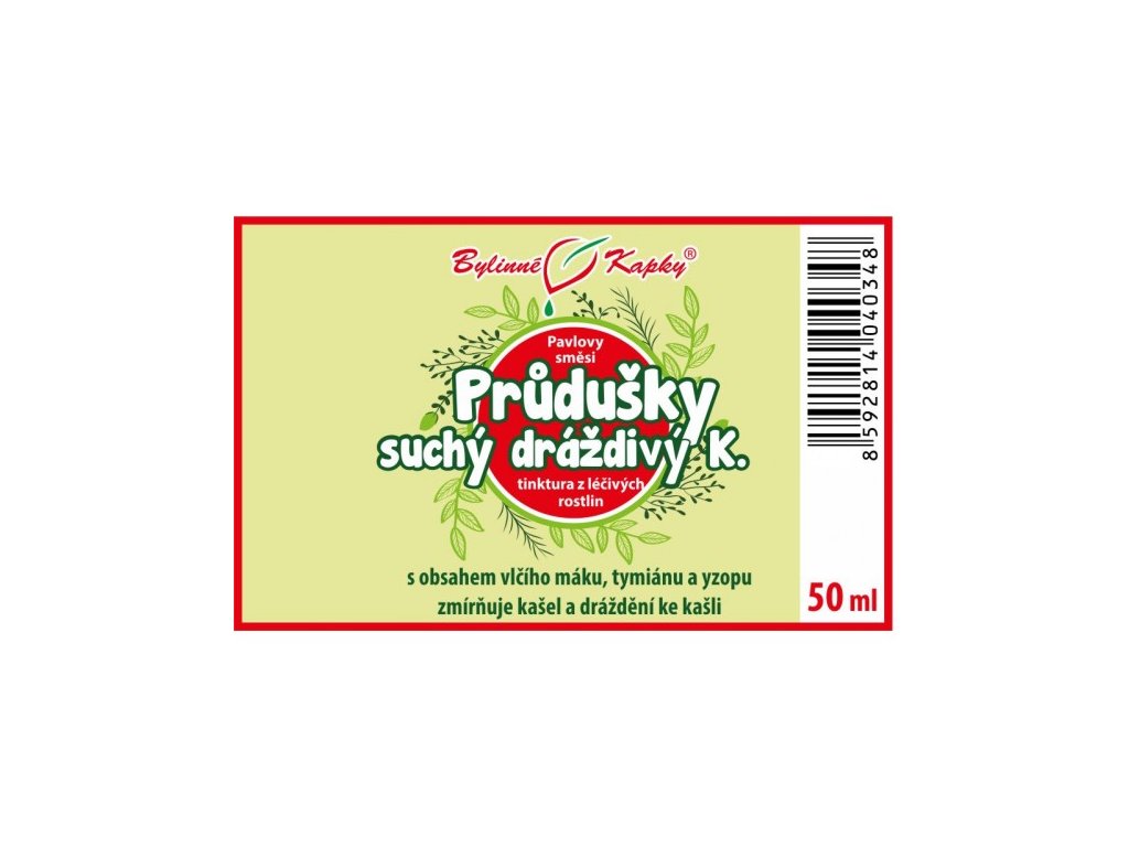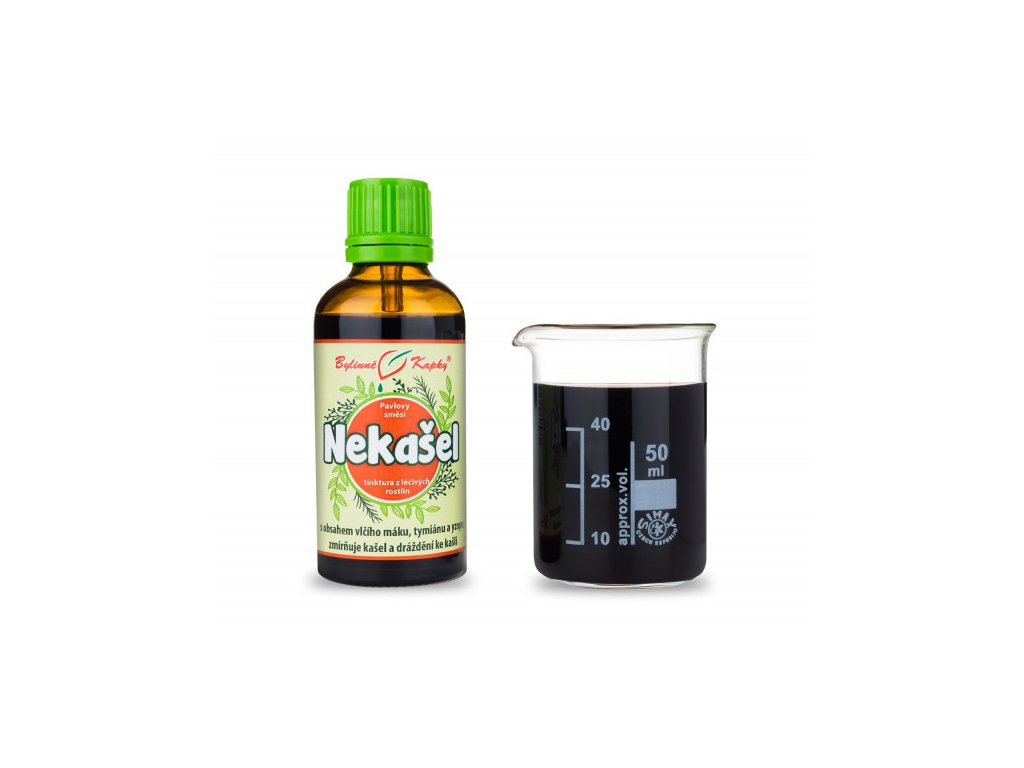 Průdušky - suchý K. (dříve Nekašel) (bylinná tinktura - Pavlovy bylinné kapky). Přírodní bylinný extrakt z léčivých rostlin pro normální funkce dýchacího systému. Ovlivňuje dráždění průdušek a neproduktivní suchý K. nekašel
